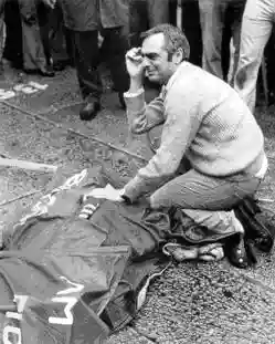 The photo that became the icon of the massacre, along with the one portraying Manlio Milani seeking help as he holds his dying wife's head, Livia Bottardi, was taken by a photographer from Studio Eden, a few steps from the arcades. The man kneeling is Arnaldo Trebeschi. On the ground, on the wet slabs lies his brother Alberto, a teacher and member of the PCI, covered by a banner. Arnaldo does not know yet but he has also lost his sister-in-law Clementina Calzari, also a teacher.