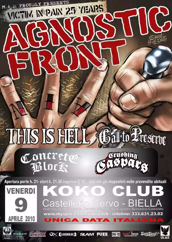 The Agnostic Front concert held at the Koko Club in Castelletto Cervo was actually a mini hardcore festival that saw four other bands take the stage before the historic New York band. Initially scheduled in Milan and then moved to the Biella area, it took Biella back at least ten/fifteen years, when stumbling upon concerts of this kind was an almost weekly occurrence at the historic Babylonia venue. It was at Babylonia where I last saw Stigma and company, during the times of albums like Somethings gotta give and Riot Riot upstart, records filled with street punk/Oi. Now, Agnostic Front are fresh off an album like Warriors which nods to thrashmetal/core especially in its production, and this was evident in tonight's live performance with the two-guitar lineup.