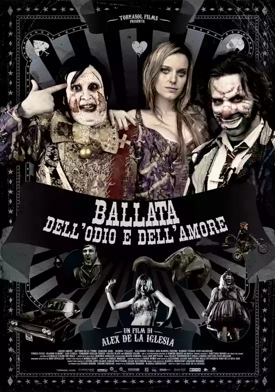 A love story like "Beauty and the Beast," only here, there are two beasts: Javier, the "sad clown," shy and introverted, completely unable to make people laugh; and Sergio, the "funny clown," beloved by children but domineering and violent once the red nose is removed. The object of desire is the stunning Natalia, a sweet and slutty acrobat, a Virgin Mary in need of an angel of death.