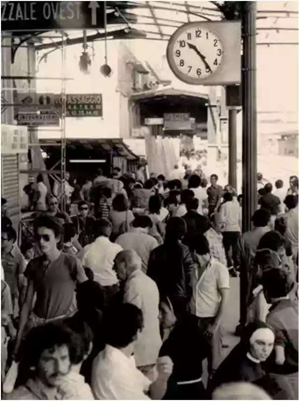 A normal, sweltering summer day. One of many, where the sun drenches everything with its relentless rays. It's late morning and a photo is taken at the central train station. It's not an artistic shot, capturing neither a particular view nor any special lighting. Just ordinary people. People crowding the platform of the first track, further heating the tiles already roasted by the sun. What does this photo hide? It seems absolutely anonymous. However, the clock above reads 10:24, and that is the platform of Track I at Bologna station.