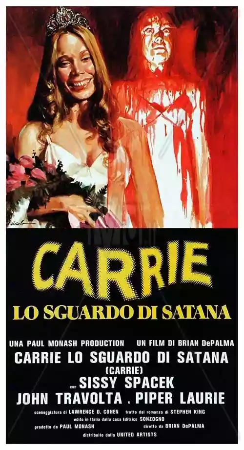 Due to my age, I missed the theatrical release of "Carrie," which was renamed "Carrie, lo sguardo di Satana" in our country. However, through dictionaries and film magazines, I began to collect reviews and photos from the film. I was a child who preferred clippings from printed pages to playing soccer, and the face of Sissy Spacek, whom the press at the time described as "the plain diva," became etched in my mind indelibly, I can affirm today after so much time has passed. This year marks the film's fortieth anniversary; in 1976 it won the Avoriaz Horror Festival and earned Spacek her first Oscar nomination. When it finally aired on TV at the end of the '80s, I realized it was even better than I had imagined. What fascinated me about Carrie was her ability to be both anonymous and attractive within the same frame, fragile or unleashed, victim or executioner—she contained multitudes, to paraphrase Whitman, and the film seamlessly transitioned from comedy to horror. Some images I had on paper came to life and magnified their effect—one in particular, when the mother stabs Carrie in the back. The story is well-known: Carrie is bullied at school by her peers, invited to the final prom by the handsome college guy only to be pranked, and she takes revenge by unleashing psychokinetic powers that cause a massacre. The poster you see is one I had in my room for a long time, which I got from S.A.C. in Rome, a wonderful place where you could find original posters and placards from a multitude of films. I don't know if it still exists; perhaps it is only a place of memory now, but the film endures, even against the sequel which I refused to watch, and I hope it will be suitably celebrated this year!