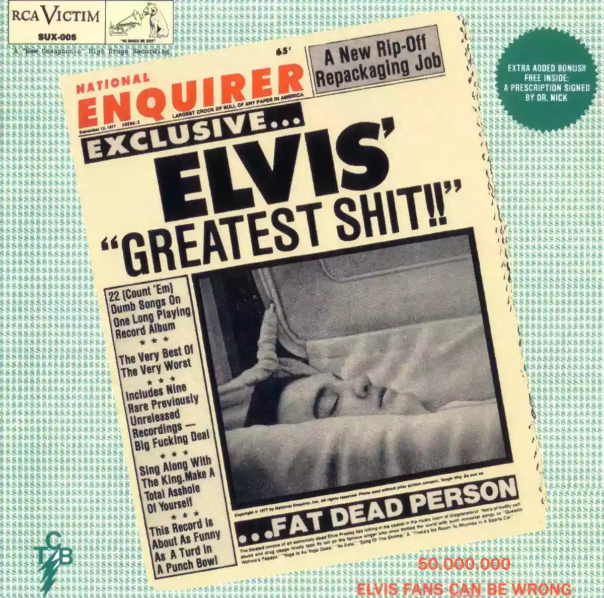 A character so acclaimed and revered, so much so that an infinite number of fanatics, macro religions in the state of Nevada, and places of worship have been built around him, has accomplished a feat that no one else has ever attempted: an album of the greatest crap ever played by the pompadour, although it must be clarified that, of course, the idea didn't touch Elvis's blown neurons at all, since this double LP is a bootleg album released by Dog Vomit in 1982. Also, because an official album of nothing but pure crap would not only have been a suicide mission for the pompadour's record label, RCA (with the RCA victor logo on the cover transformed into RCA victim) given the highly offensive content of the work, but no sane person would ever pay for an album of bad songs.