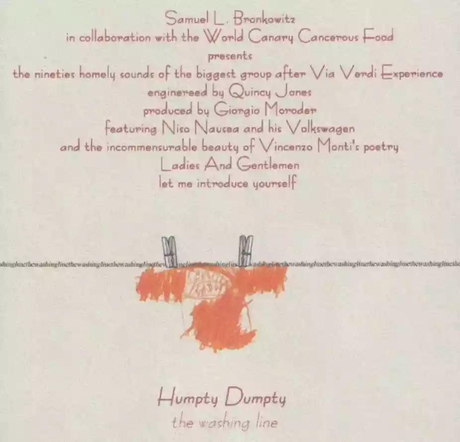 The debut of Humpty Dumpty is quite a heterogeneous stew of amateurly recorded material between 1995 and 2000 with a 4-track used at the bare minimum of its possibilities. 77 minutes (the maximum capacity of an audio CD at the time, in defiance of all common sense) for 36 sound testimonies of a psyche loosely held together by an intense taste for Barrett-like psychedelic songwriting and by a frenzied formal carelessness.