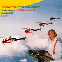 This, folks, is the music of "Helikopter-Streichquartett": a tense sonic continuum that lasts about half an hour in which the helicopters are treated as percussion instruments (thanks to the noise/sound of the blades and rotors) and the four string instruments imitate the helicopters by playing in tremolo an intricate web of ascending and descending glissandi. The reference recording edition is that of Stockhausen-Verlag: a double CD featuring the recording of the world premiere in Amsterdam with an introduction in English by Stockhausen himself (7 minutes) and final comments with pilots, musicians, and audience at the end of the performance (14 minutes); in addition to the studio recorded version, with 3 additional minutes of music composed by Stockhausen after the first performance and included as the finale in the definitive version of the quartet.