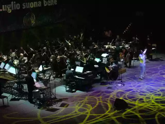 The auditorium's Cavea is a semi-elliptical space that harkens back to Greco-Roman tradition, but reimagined in contemporary forms. Personally, I like the Auditorium, although when wandering through its corridors I've sometimes had the peculiar sensation of being in a gigantic parish hall, perhaps because of the ochre brickwork that covers it, or due to contemporary architecture that in the late twentieth century spared not even churches. Anyway, sitting there, the three enormous shell-shaped rooms loomed over us like immense spaceships on the pleasant summer evening. Judging by the audience turnout, Serj must have had considerable success with his solo album (released three years ago, editor's note), as by the start time it numbered around two thousand to two thousand five hundred people. Scheduled for nine o'clock, it took quite a bit of encouragement from the Cavea stands ("Ser-gio-Ser-gio"), but at nine fifteen, the lights dimmed, and five minutes later, the audience applause welcomed the forty-piece Italian Philharmonic Orchestra, plus piano and acoustic guitar.