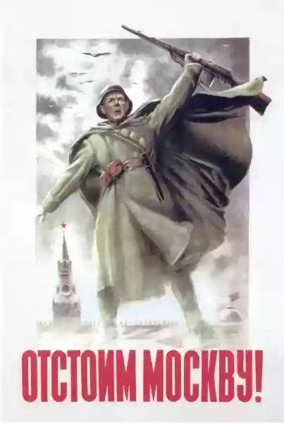 The poster "Otctonm Mockby!", meaning "I will defend Moscow!" was printed and pasted on every corner of the Soviet capital. The inscription that serves as the pedestal for a Red Army soldier with a determined and tenacious expression served as encouragement to the hundreds of thousands of Muscovites, engulfed in the "total war" against Hitler's Germany. The population's response to the Nazi invader was formidable and bloody, and there remains nothing but to applaud the vigorous Russian patriotism that finds few equals so exceptional. The applause derives from the sacrifice of people who, in the span of twenty years, were battered by civil war, the crimes of the NKVD bred from Stalin's madness, and all the violent wounds inflicted by a monster that preferred to soak the noble spirit of an utopia in blood.