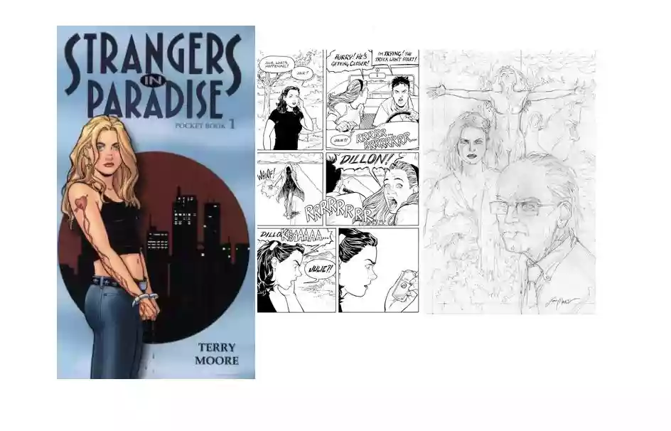 "Strangers in Paradise", for its devoted fans briefly SIP, is a story conceived, written, and drawn - in black and white - by author Terry Moore, originated from the USA, who divided it into three separate series from 1993 (birth year - Atlantic Press) to 2007 (conclusion - Comic USA). Of difficult availability (in Italy since 1998 and still ongoing, theoretically it would have fixed bi-monthly publication, in reality, it comes out whenever it wants and in different newsstands and bookstores) this comic is in fact a NOVEL narrating the events of the protagonist Katina Choovanski (Katchoo), a young artist no longer an adolescent, of her best friend Francine Peters, her forbidden love, and of David Qin, the common friend who positions himself at the center of the triangulation analyzed in every nuance of the complex relationship that ensues between them.